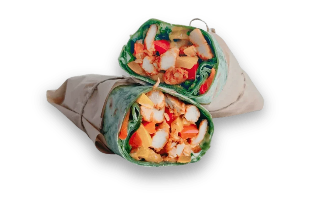 Spinach Tortilla, Marinated Chicken, Mix Capsicum, Baby Spinach & Cheddar Cheese.