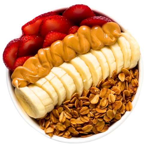 Your choice of base topped with banana, strawberries and homemade granola and peanut butter.