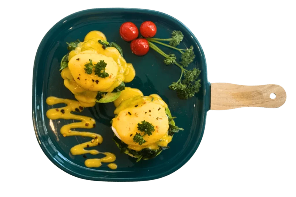 A toasted English muffin piled high with creamy avocado, sautéed baby spinach, and a perfectly poached egg, all blanketed in rich hollandaise and sprinkled with fresh parsley, cherry tomatoes, a hint of garlic, and a dash of chili flakes for a wholesome, flavorful twist on a classic Benedict