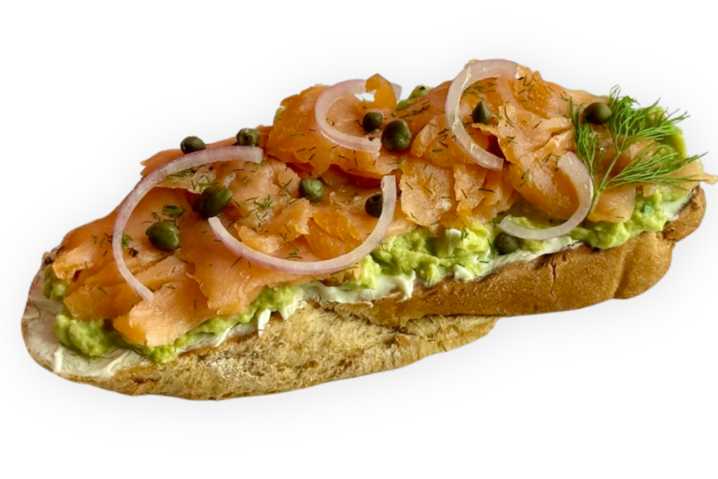 Sourdough bread, smoked salmon, guacamole, cream cheese, tomato, cucumber, red onion and capers.