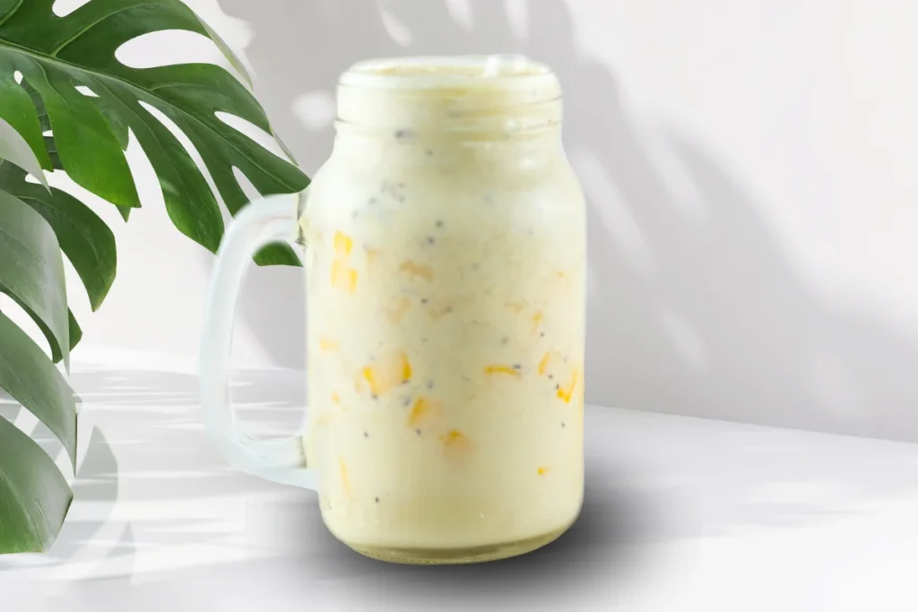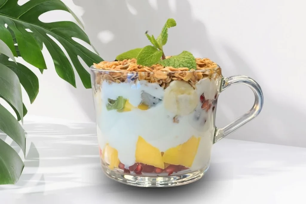 Mango Pudding with banana, fresh yogurt, pineapple, cornflakes, coconut chops, and honey.