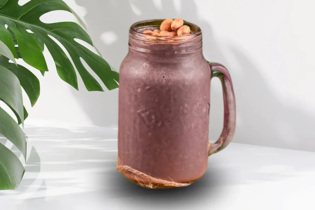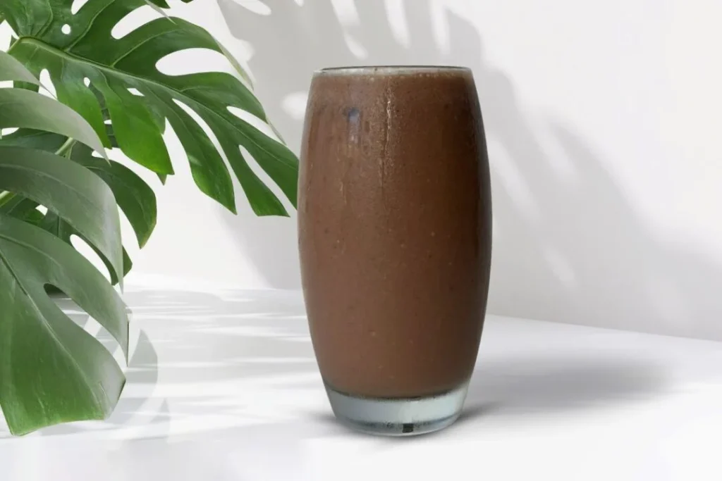 Almond Milk, Cocoa Powder, Banana, Peanut Butter, Oats and chia seeds.