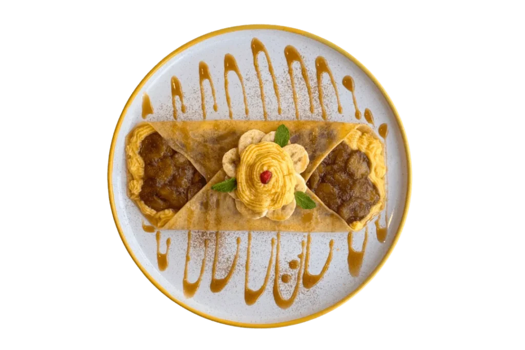 Indulge in the sweet richness of caramelized banana, cinnamon, and brown sugar, all wrapped in a delicate crepe. Finished with a drizzle of caramel syrup and a touch of fresh mint, this crepe delivers a perfectly balanced, golden treat.