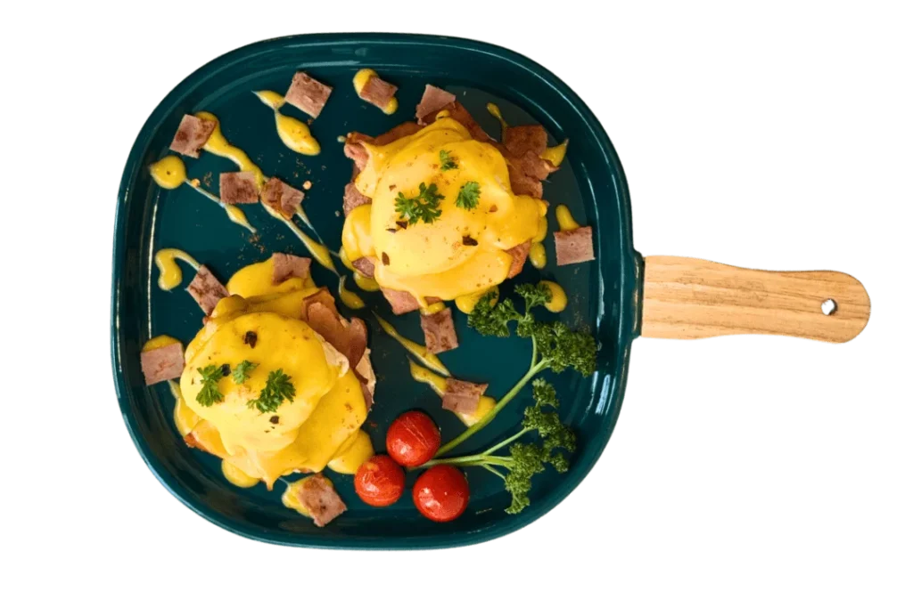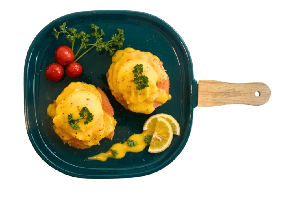 A toasted English muffin topped with velvety cream cheese, silky smoked salmon, and perfectly poached eggs, all drizzled with rich hollandaise, fresh parsley, and a zesty sprinkle of lemon, chili flakes, and cherry tomatoes for a breakfast that’s pure indulgence.