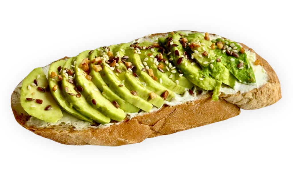 Sourdough bread, cream cheese, sliced avocado, toasted garlic, flaxseeds, and sesame seeds.