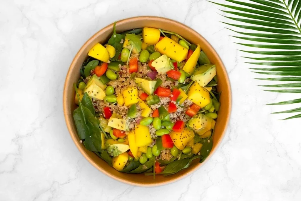 Baby spinach, mix quinoa, red capsicum, yellow capsicum, red onion, edamame, mango, avocado, chia seeds and parsley tossed with sweet lime dressing.