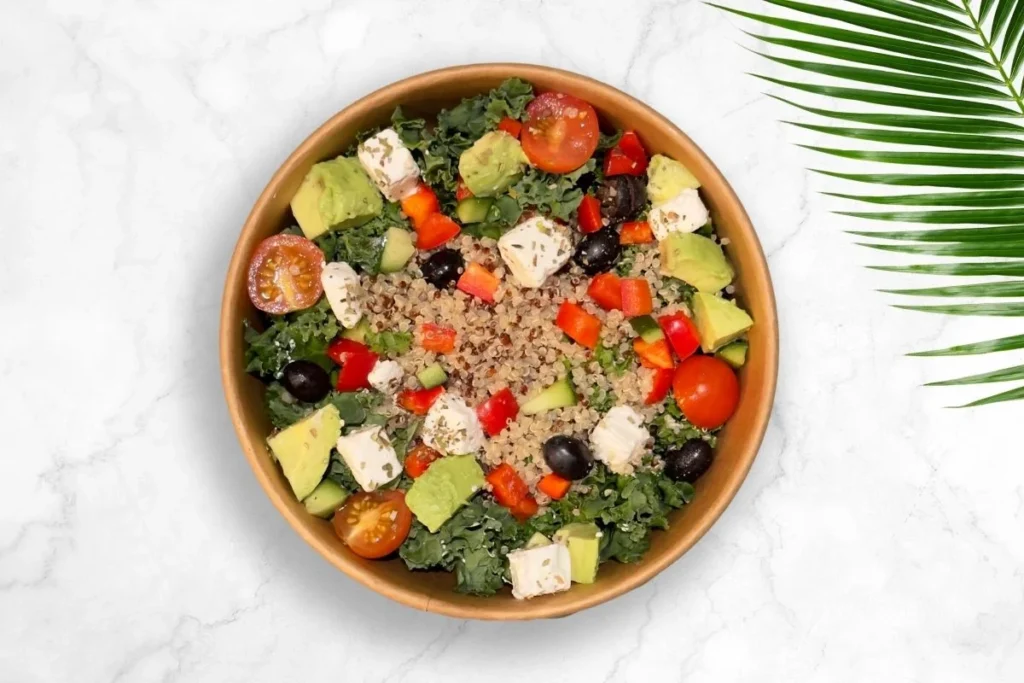 Kale leaves, tomato cherry, quinoa, cucumber, red onion, red capsicum, black olives, avocado, feta cheese and dried oregano, tossed with creamy house dressing.