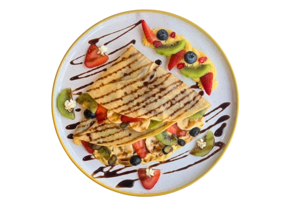 A vibrant blend of fresh strawberries, bananas, kiwis, and blueberries layered with creamy pastry cream. Drizzled with chocolate syrup and topped with a rich blueberry compote, this crepe bursts with fruity goodness in every bite.