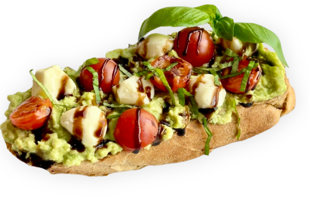 Sourdough bread, guacamole, cherry tomato red, mozzarella ball, olive oil, balsamic glaze with basil leaves.