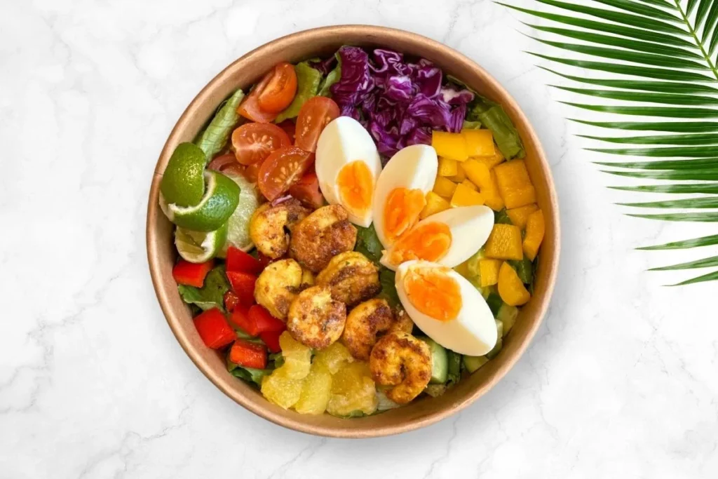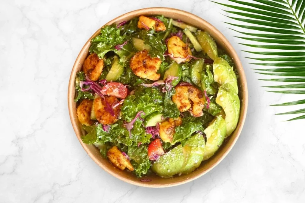 Kale Leaves, red cherry tomato, cucumber, red cabbage, parmesan cheese, shrimps and house dressing.