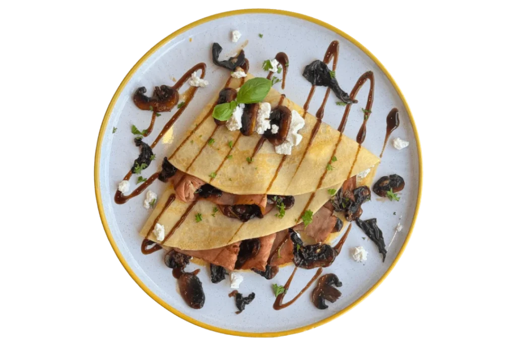 Savor a delightful mix of tender turkey, fresh baby spinach, sautéed mushrooms, and creamy feta cheese, all wrapped in a perfectly crafted crepe. Finished with a touch of garlic, butter, and balsamic glaze, this gourmet creation offers a rich, flavorful experience in every bite.