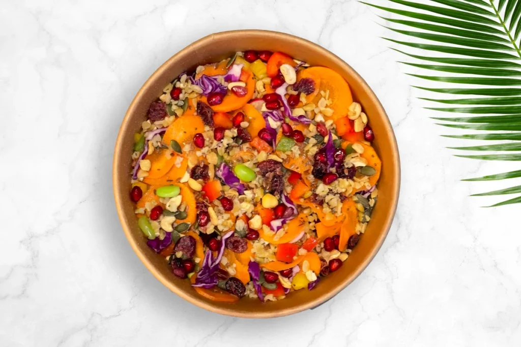 Freekeh, carrot, purple cabbage, edamame, spring onion, mix capsicum, chickpeas, beetroot, pomegranate, reddish, dried cranberries, cashew nuts, pumpkin seeds, chia seeds, flax seeds and parsley tossed with honey dressing.
