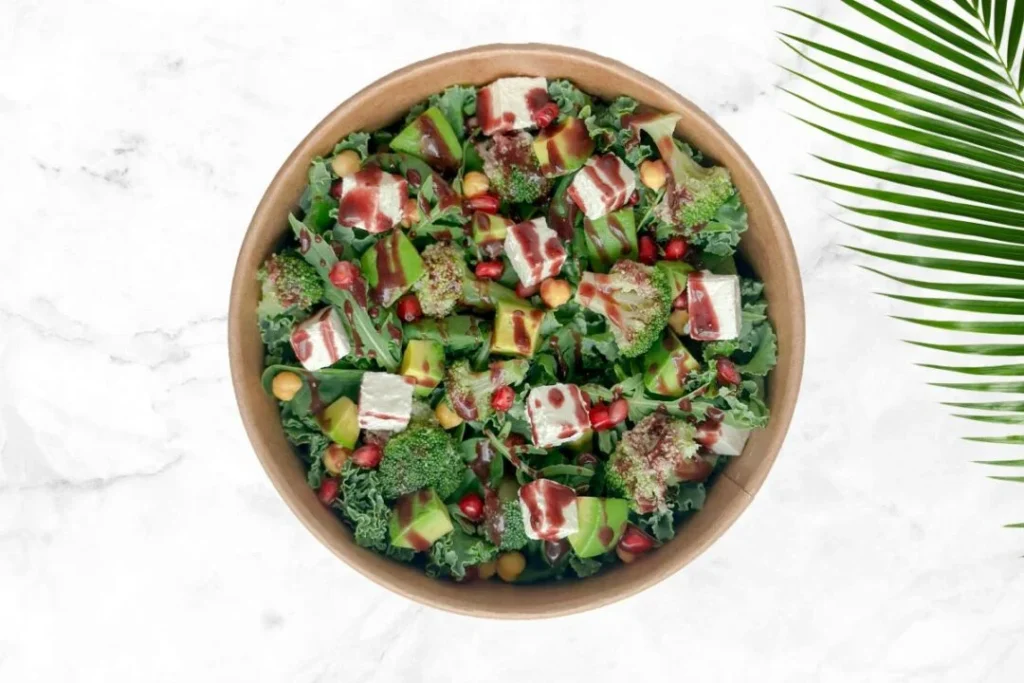 Kale Leaves, Baby Spinach, Arugula, Broccoli, Chickpeas, Avocado, Pomegranate, and Feta Cheese served with Acai Dressing.